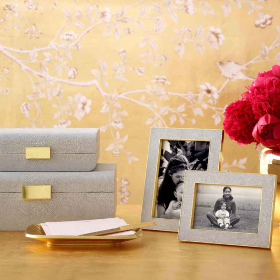This modern yet classic frame juxtaposes the luxury and texture of embossed shagreen trimmed in polished brass. The versatile color elegantly displays a favorite family photo or a small piece of art.